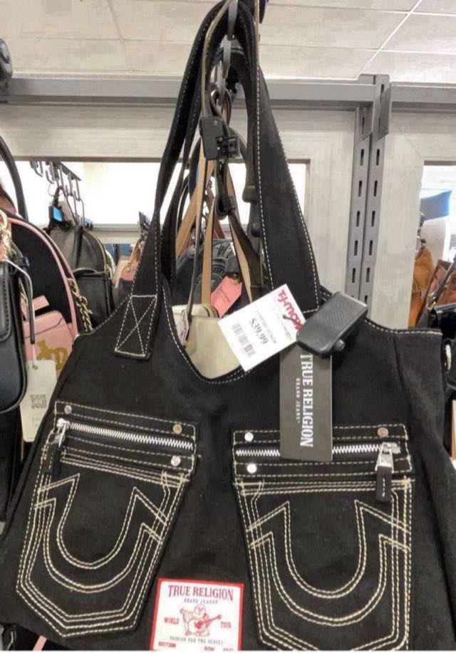 A stylish black tote bag featuring signature True Religion stitching and zippered pockets.