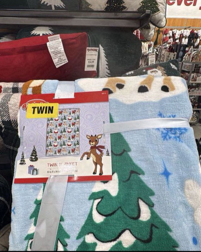 A cozy twin blanket featuring a winter-themed design with trees and snowflakes.