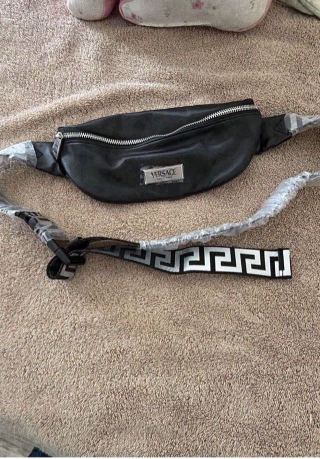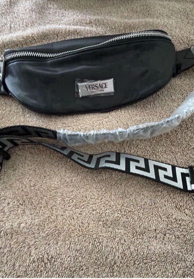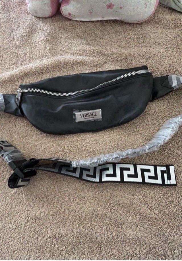 A stylish black fanny pack featuring a zippered closure and a detachable strap with a distinctive Versace pattern. Ideal for hands-free convenience while adding a touch of luxury.