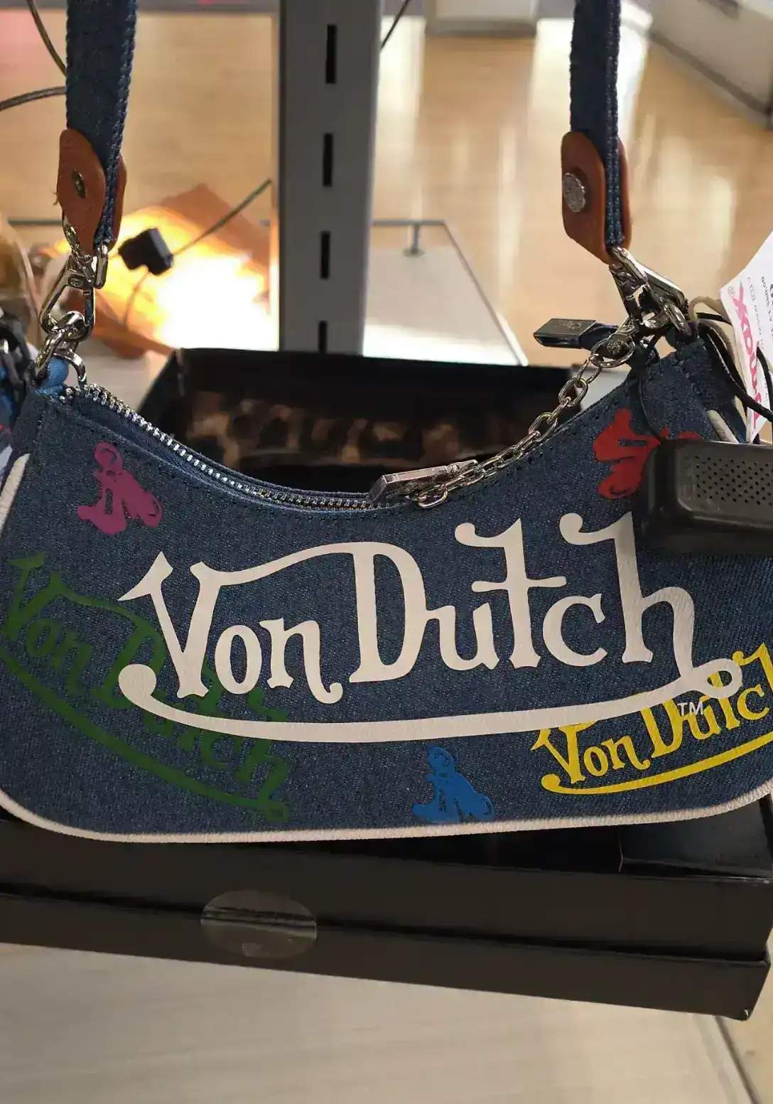 A stylish denim handbag featuring colorful Von Dutch logos and a chain strap.
