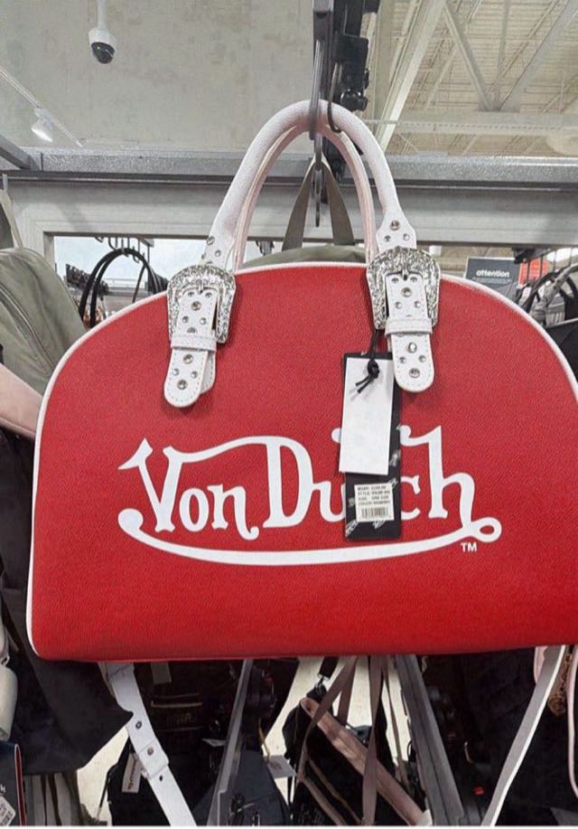 A stylish red handbag featuring the Von Dutch logo and embellished straps. Perfect for adding a pop of color to any outfit.