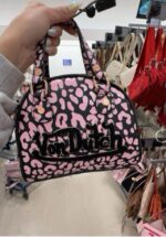 A stylish handbag featuring a pink and black leopard print design with the Von Dutch logo prominently displayed.