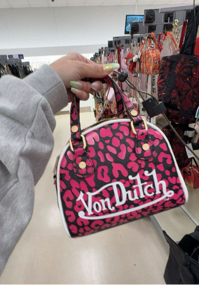 A stylish handbag featuring a pink leopard print design with the Von Dutch logo.