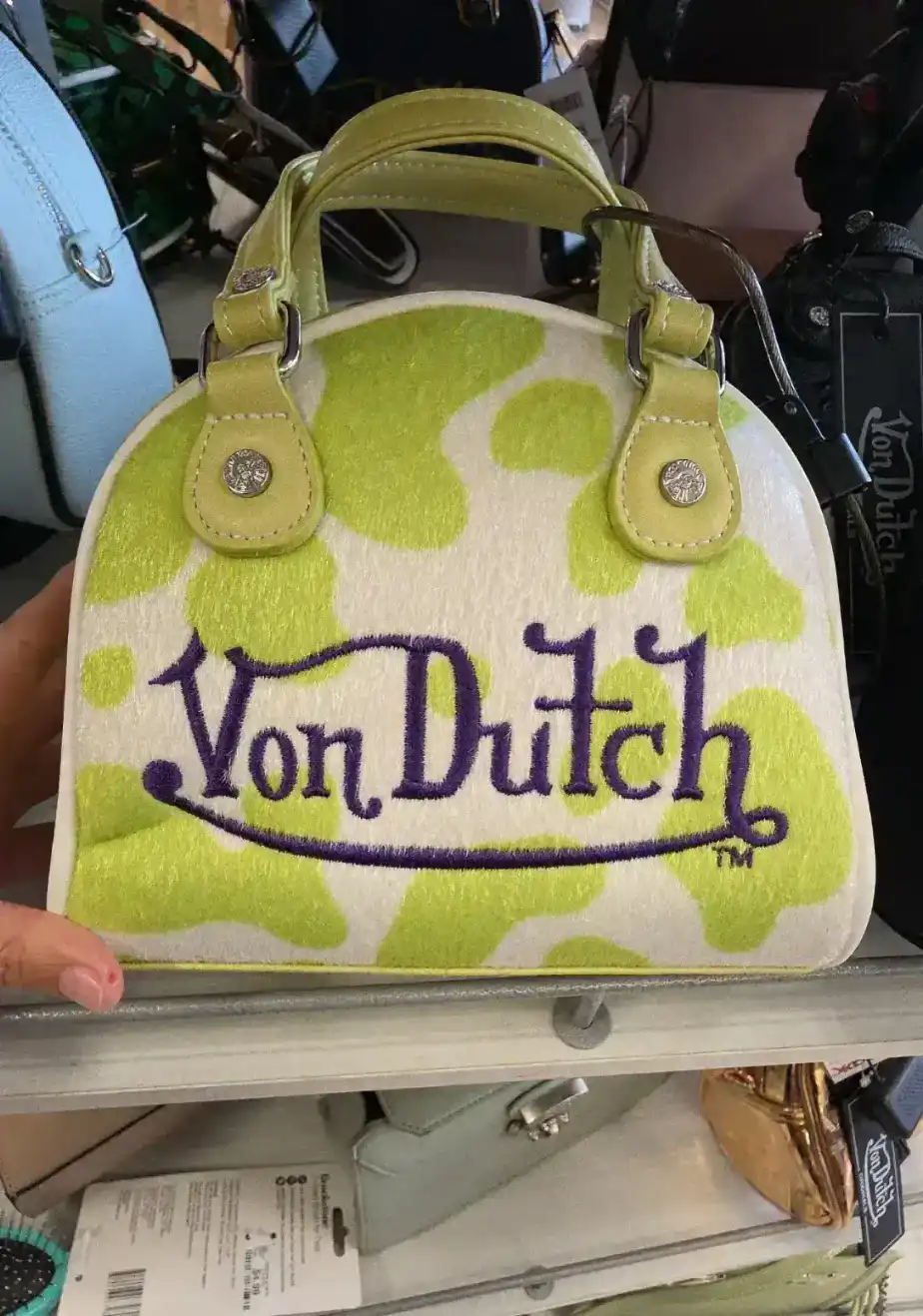 A stylish handbag featuring a vibrant green and white cow print design with the Von Dutch logo prominently displayed.