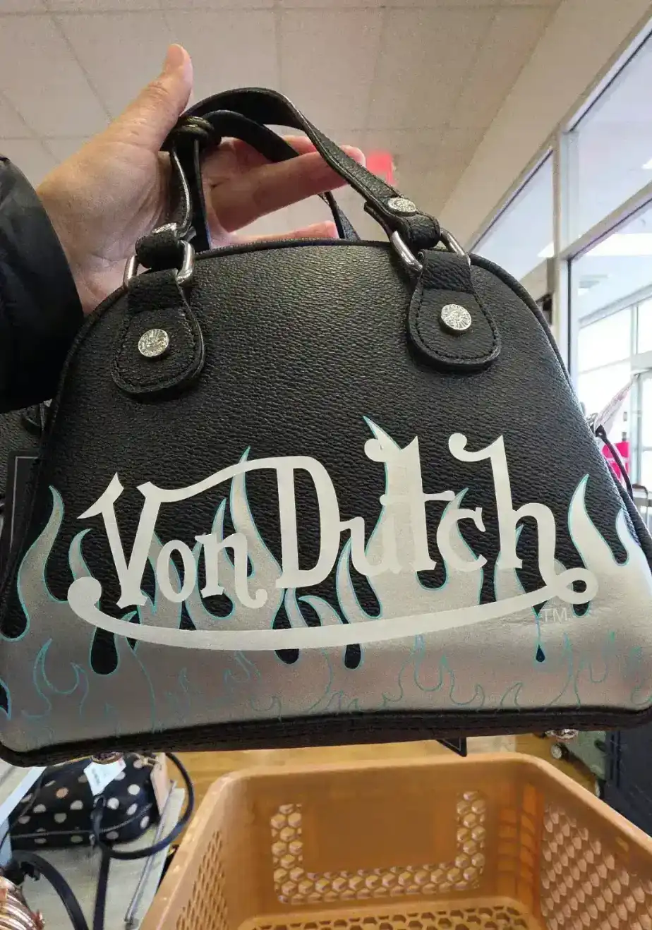 A stylish black handbag featuring a flame design and the Von Dutch logo.