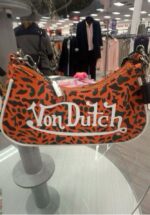 A stylish orange and black leopard print handbag featuring the Von Dutch logo.