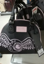 A stylish mini handbag featuring a unique owl design with a black and pink color scheme.