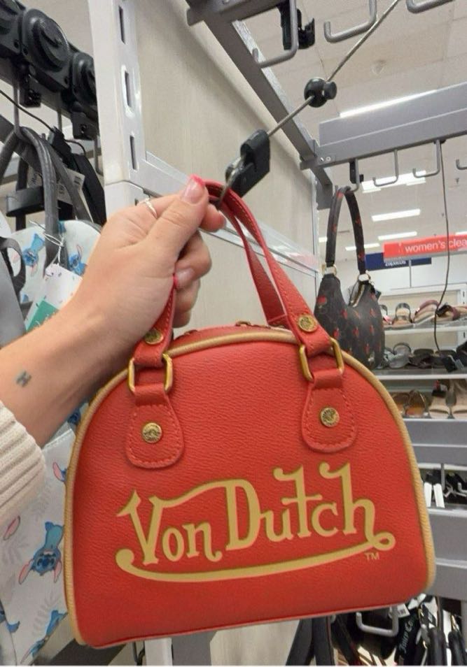 A stylish red mini handbag featuring the iconic Von Dutch logo in yellow.