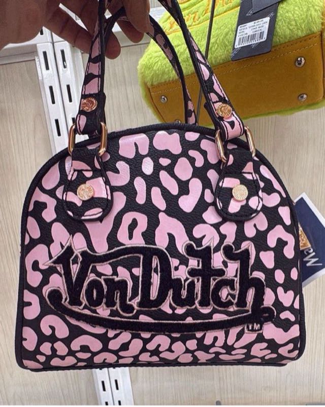 A stylish mini handbag featuring a pink and black leopard print design with the Von Dutch logo.
