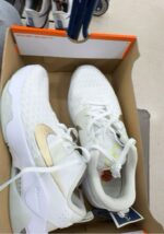 A pair of white athletic shoes with gold accents, designed for comfort and performance.