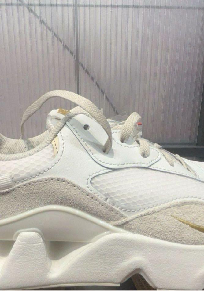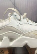 Stylish white athletic sneakers featuring a mix of leather and suede materials.