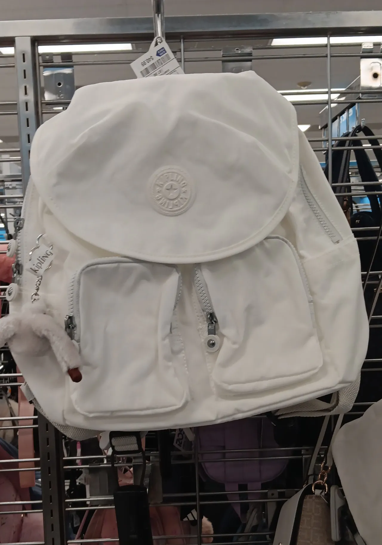 Kipling stylish white backpack with multiple zippered pockets and a rounded flap.