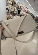 A stylish white crossbody bag featuring a subtle embossed logo design and a sleek metal clasp.
