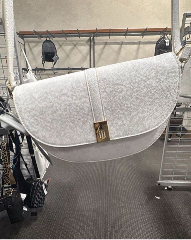 A stylish white crossbody bag with a sleek design and a gold clasp.