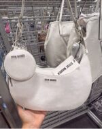A stylish white handbag with a unique shape and a detachable circular pouch.