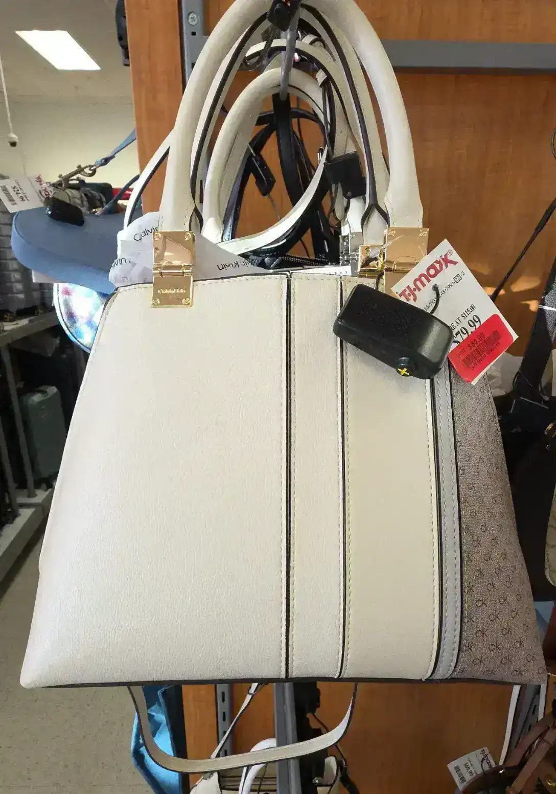 A stylish white handbag with gold accents and a unique design.