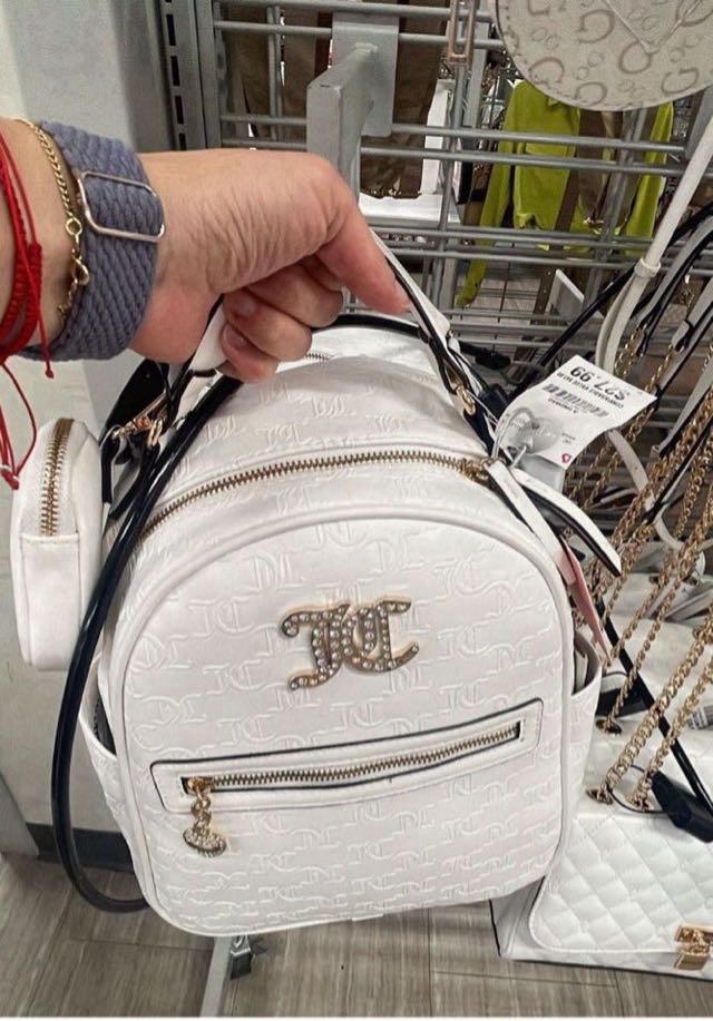 A stylish white backpack featuring a prominent logo and gold accents. Perfect for everyday use or a chic outing.