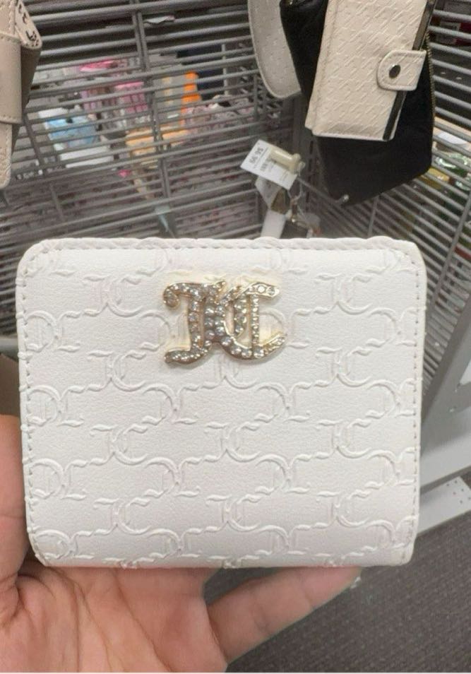 A stylish white wallet featuring a textured logo design and a gold-tone clasp.