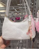 A stylish white handbag featuring a quilted design with floral accents and a pink tassel charm.