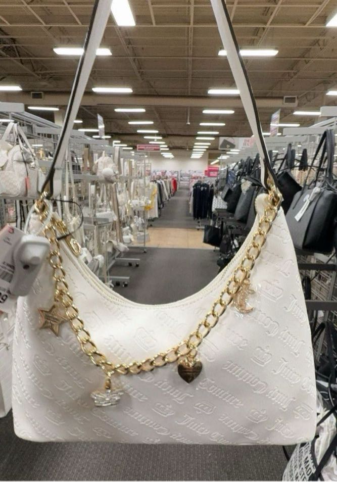 A stylish white shoulder bag featuring embossed detailing and decorative charms.