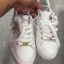 Stylish white slide sandals featuring a gold logo embellishment.
