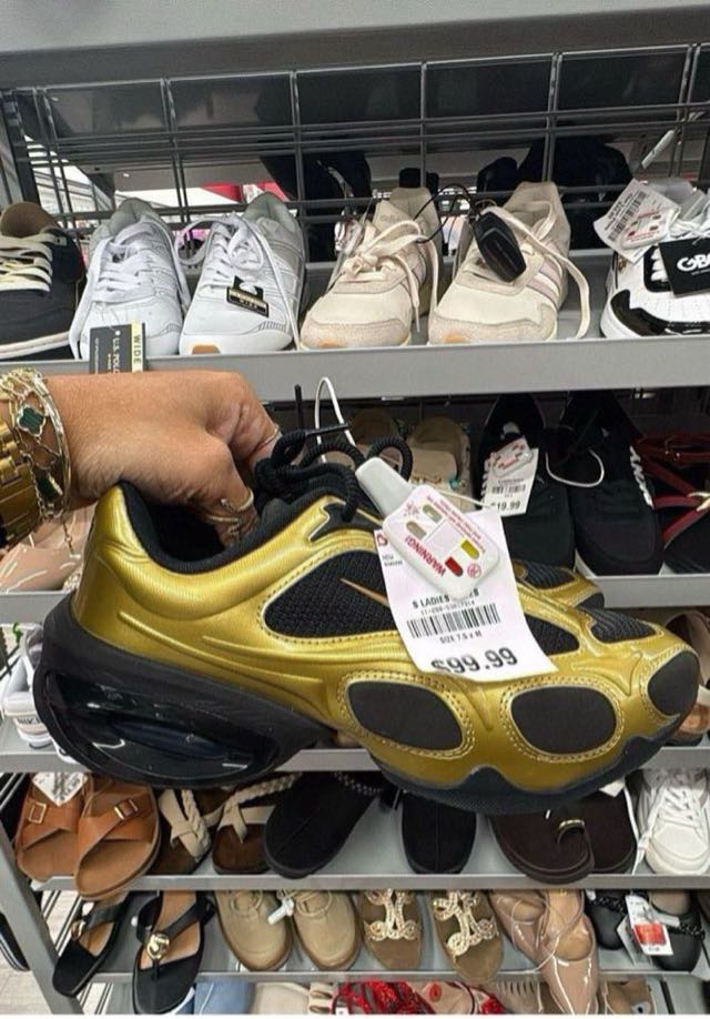 Stylish gold and black sneakers featuring a unique design and comfortable fit. Perfect for casual wear or athletic activities.