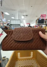 A stylish woven brown wallet with a flap closure, perfect for everyday use.