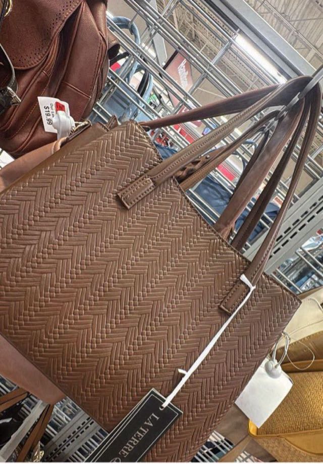 A stylish brown woven tote bag with sturdy handles, perfect for everyday use. Its structured design makes it both functional and fashionable.