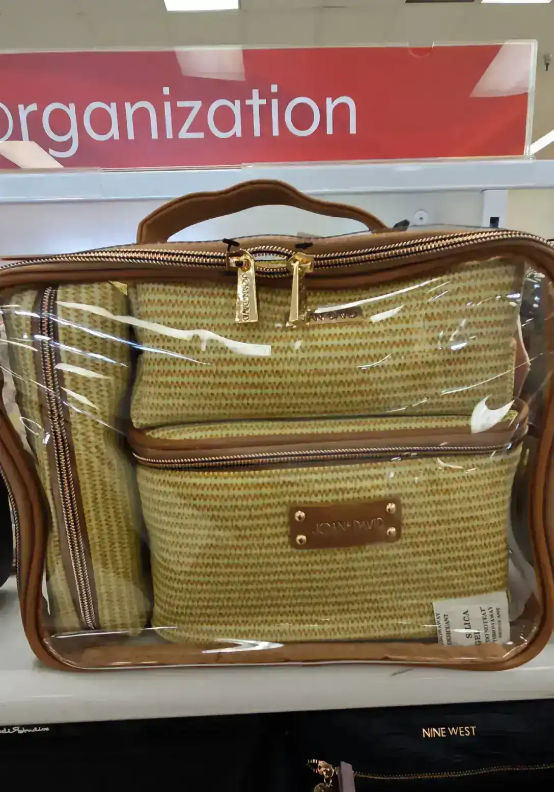 A stylish woven tote bag with a structured design and multiple compartments for organization. Ideal for everyday use or as a travel accessory.