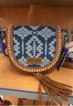 A stylish crossbody bag featuring a blue patterned design with a brown leather trim and tassel.