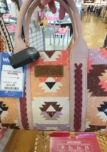 A stylish handbag featuring a colorful geometric pattern with braided accents.