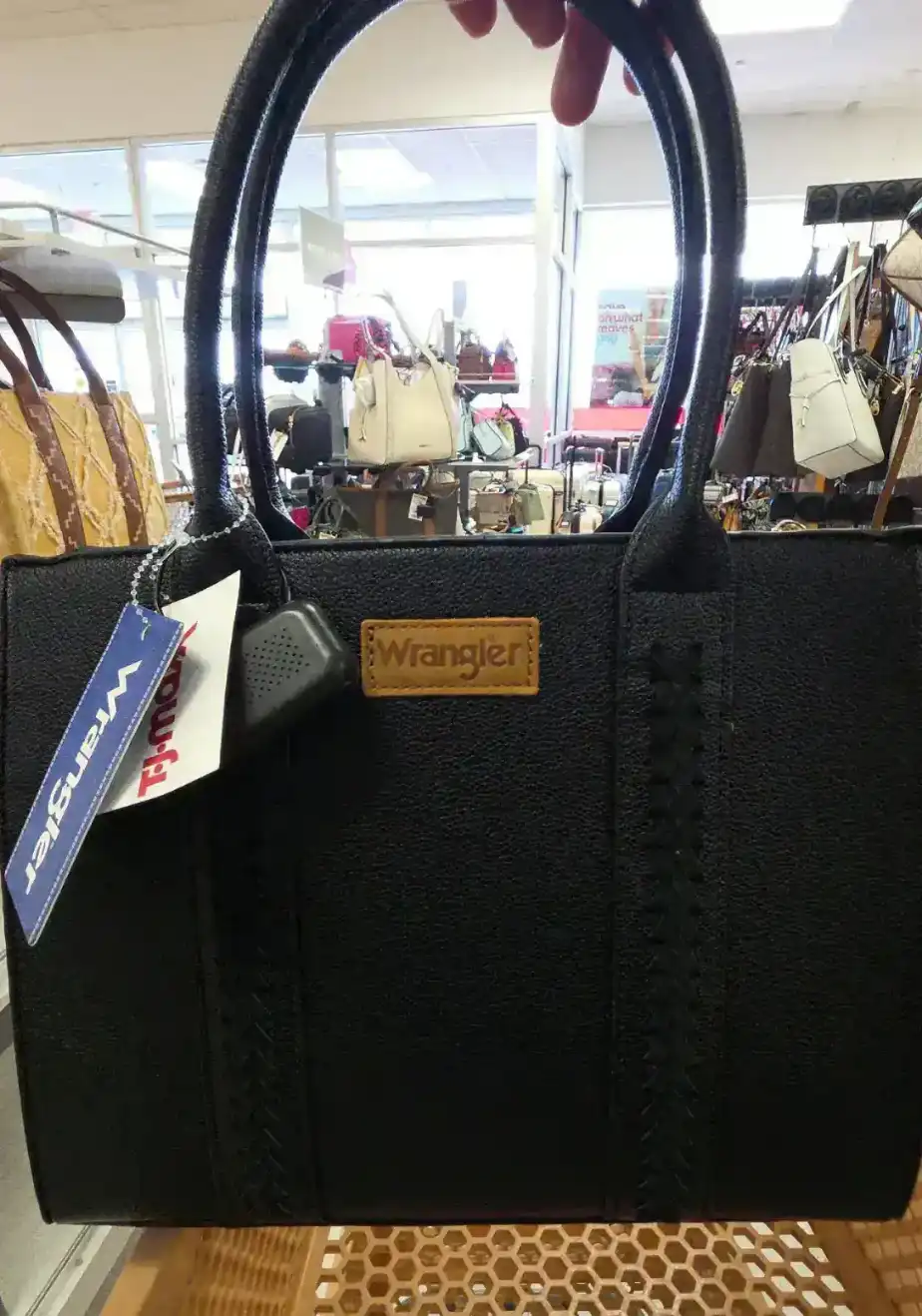 A stylish black handbag with a textured finish and a Wrangler logo.
