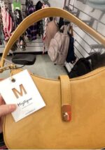 A stylish yellow handbag with a clasp closure and a shoulder strap.